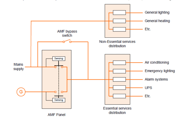 A UPS standby generator should have a mains-powered engine water heater and battery charger. It must also communicate when it starts and stops in response to mains supply failure and subsequent restoration. This is usually handled by an Automatic Mains Failure (AMF) panel that includes the necessary signals. Fig.1 shows how an AMF panel is used with a generator as part of a protected power installation.