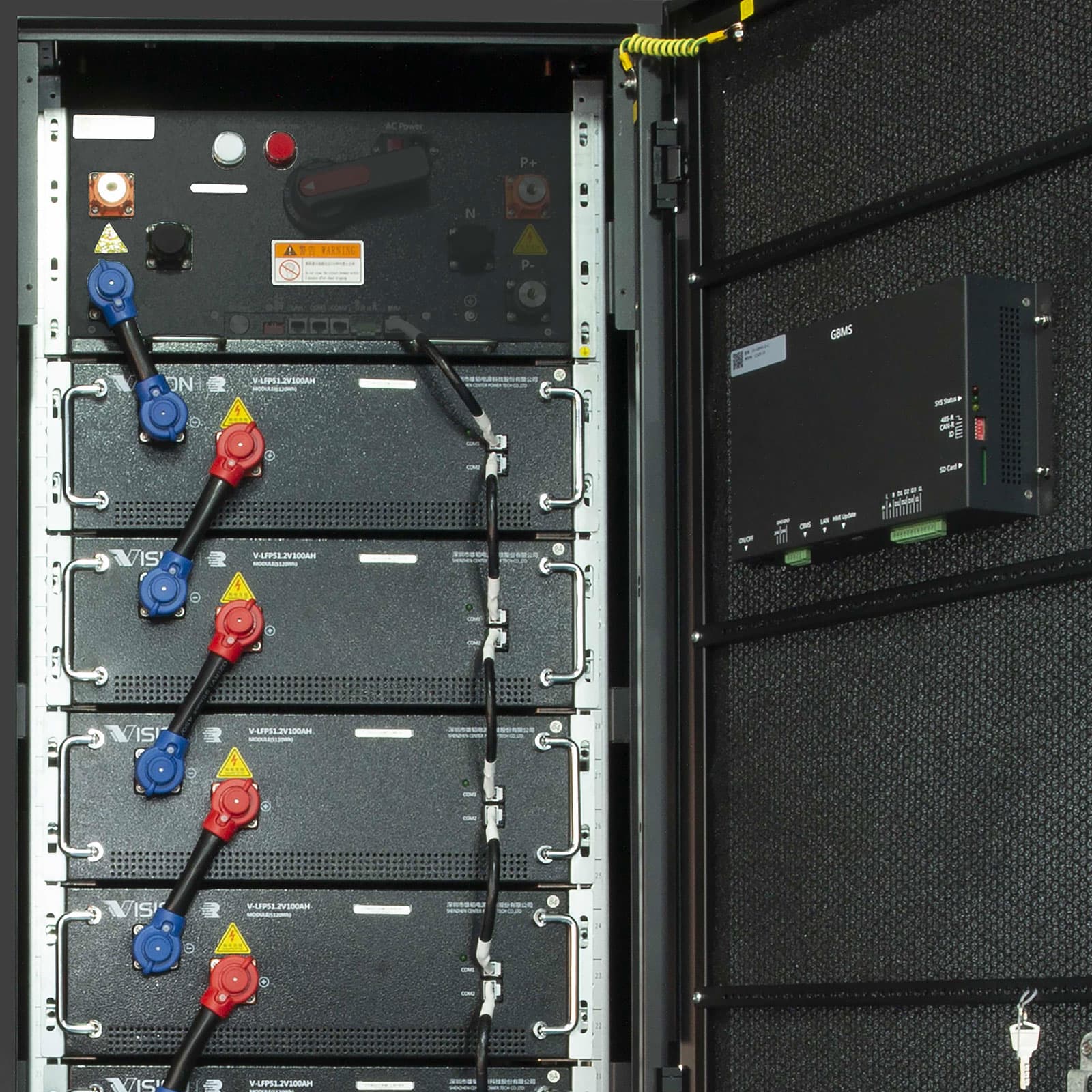 In addition, a System BMS with screen provides central control and real-time reporting of cabinet status to external systems via CAN, RS485 and dry contacts.